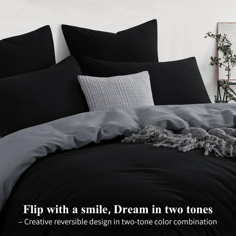 Aisbo Double Size Duvet Cover Set - 3Pcs Reversible Bedding Bed Set Black and Grey Double Soft Brushed Microfiber Quilt Cover with 2 Pillowcases 50x75cm