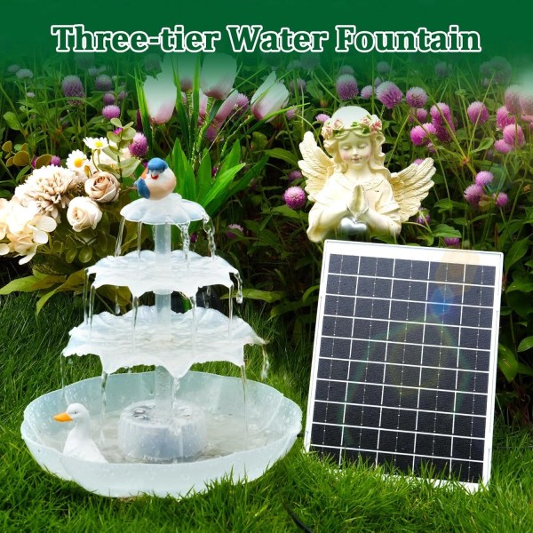 The 6.5W Solar Pump with 3 Tiered Bird Bath is equipped with 8 LED lights, it can bring you a beautiful visual feast at night. It also comes with a battery that automatically charges during the day in direct sunlight, creating a mesmerizing light show at night.
