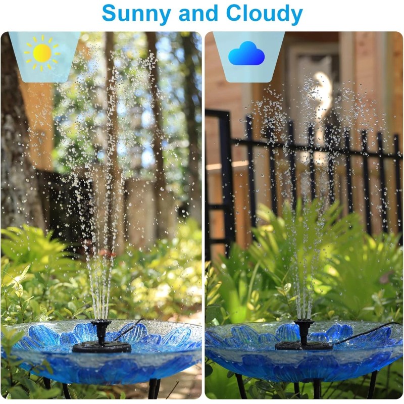 Our solar water fountain contains three sets of nozzles, Rotating Nozzle Set, Fixed Nozzle Set and Mushroom Splash Nozzle Set. You can combine two rotating spray styles, four double-layer spray styles, three normal spray styles and two mushroom spray styles. These spray styles are perfect for birdbaths, gardens, ponds and fish tanks. Please refer to the manual for the combination method.