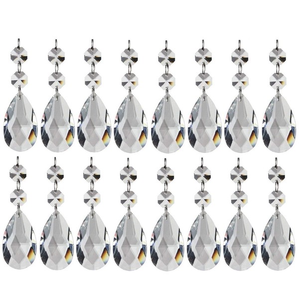 This Beautiful Collection of 16 High Quality NEW Faceted Clear Teardrop crystal Glass Prisms can be used for chandelier pendants, Christmas tree decorations, Weddings, Jewelry Making, Craft Project and Art. Each Prism measures 2" which includes the top jewel octagon piece and has a total hang of appx 3"s. Connectors are Silver Open Eye Pinning.