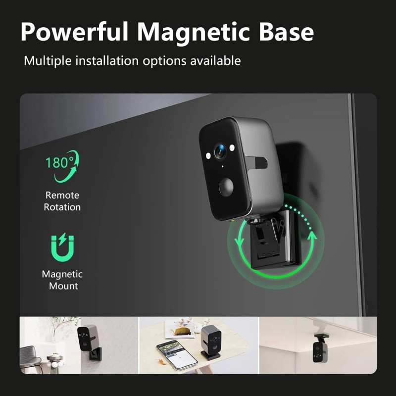 - 【Magnetic 180° rotatable Base & 100% Wireless & Bluetooth】The portable F7 features an excellent 180° rotatable magnetic base that allows it to be mounted on ferrous surfaces such as refrigerators or electrical boxes without drilling or wiring. It's easy to install, equipped with the latest Bluetooth connectivity, and the 100% wireless design makes it easy to meet the security needs of living rooms, kitchens, bedrooms, garages, farms, and more.