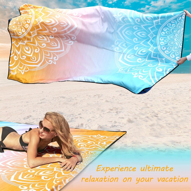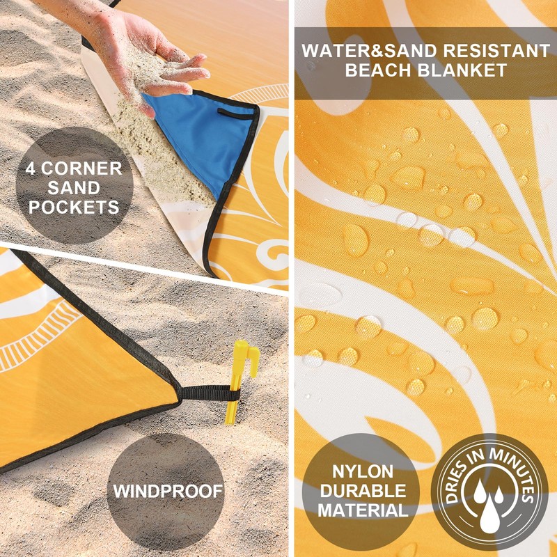 - 【Waterproof Sandproof】This beautifully colored quick-drying beach blanket is made of durable nylon. Simply shake the blanket to easily remove all the sand. The sand mat has built-in pockets in each corner, so you can anchor it to the beach by filling the side pockets with rocks, sand, or using the included anchors.