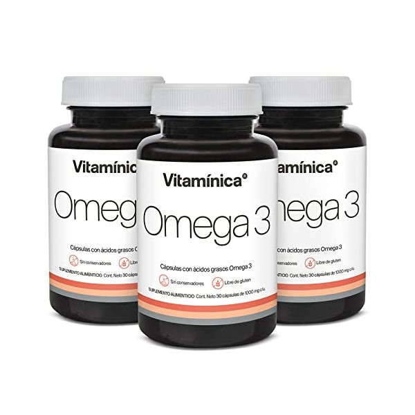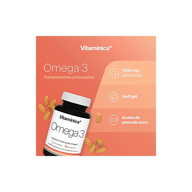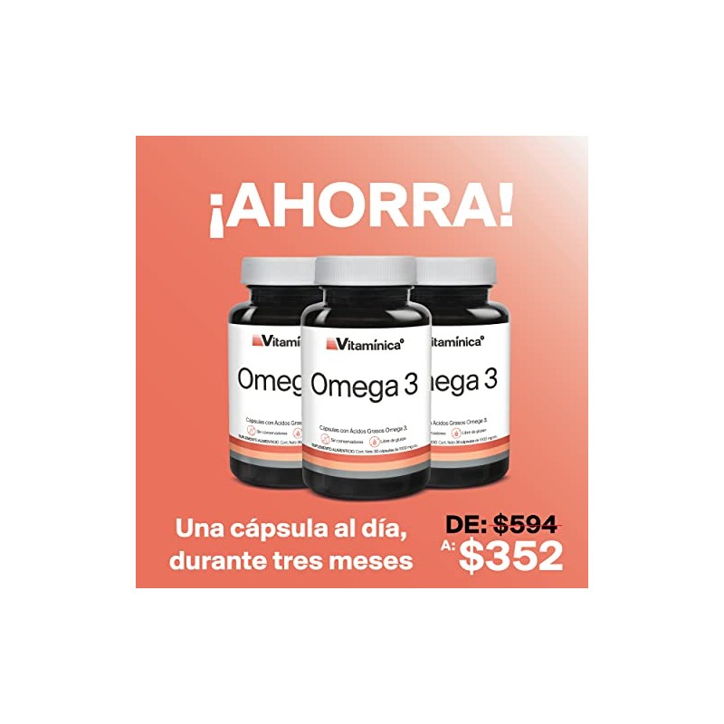 Acerca de este artículo SUPLEMENTO DE OMEGA 3: El EPA y el DHA son ácidos grasos esenciales ya que el cuerpo los necesita pero no es capaz de producirlos. Tomar nuestros suplementos de aceite de pescado puede ayudar a aumentar tu ingesta diaria de Omega 3 (EPA y DHA). PARA EL APOYO INMUNOLÓGICO: Los suplementos de ácidos grasos Omega 3 pueden ayudar a promover el correcto funcionamiento del sistema inmunológico. 300 MG DE OMEGA 3 EPA Y DHA: Cada cápsula de suplemento de DHA incluye 300 mg de omega 3 (EPA y DHA). Incluye 90 cápsulas blandas, porciones para 90 días. NUTRICIÓN DE CALIDAD: Los suplementos de omega 3 de aceite de pescado de Vitaminica están hechos con ingredientes de alta calidad, 100% libres de gluten, sin conservadores y sin maltodextrina. SUPLEMENTOS VITAMINICA: Nuestra atención a cada ingrediente y sus beneficios individuales nos permite ofrecerte productos altamente especializados beneficiosos para tu salud.