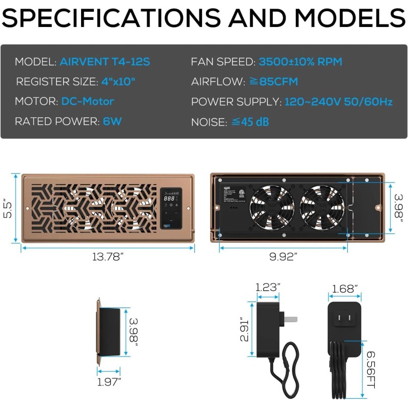 AITECAC 4"x10" Register Booster Fan Energy Efficient HVAC Vent Booster Fan w/ Controller
