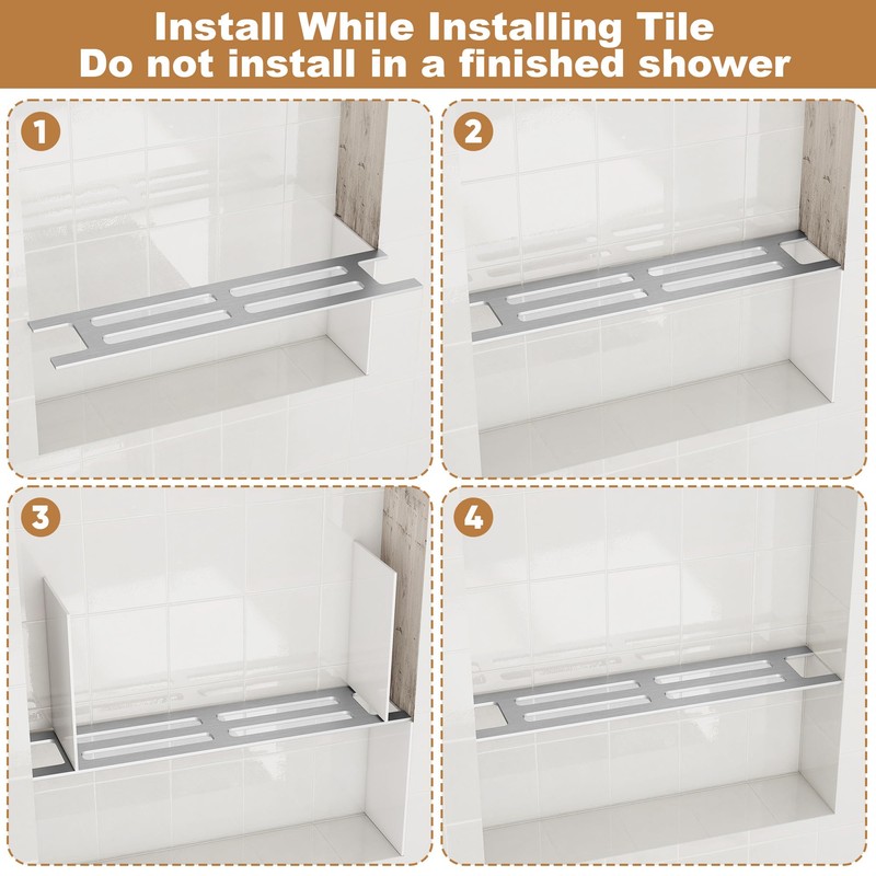 - Notes: These recessed shelves can be installed before renovation is complete. The embedded design simplifies renovation or new construction projects and can be installed during tile installation to ensure seamless embedding in the shower niche space(Cannot be installed in a finished shower niche)