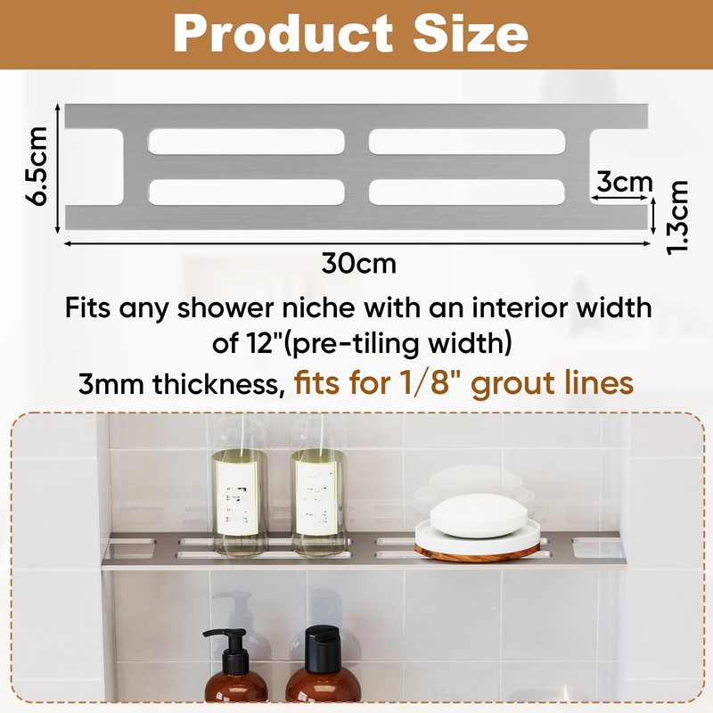 - Product Dimensions: Our bathroom niche shelf dimensions are precise, measuring 11-13/16 inches in length and 2-9/16 inches in width, suitable for any shower niche with an inner width of 12 inches; the 3mm thickness perfectly aligns with the 1/8-inch grout line