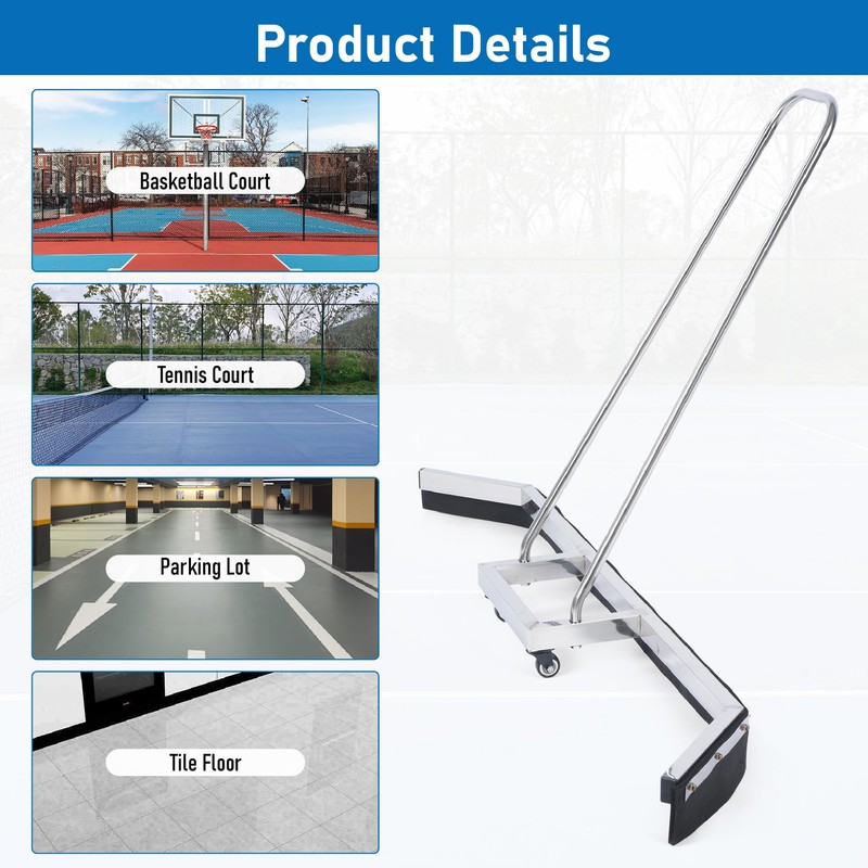 - Tennis Court Squeegee: The entire frame of the squeegee broom is made from stainless steel for wear and corrosion resistance. The 360° Universal wheels move smoothly and make very little noise.Easy to store