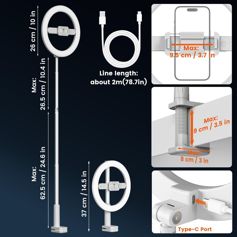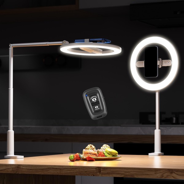 • Travel-Ready Convenience: No assembly needed! Includes a heavy-duty desk clamp (up to 3.75in), USB-powered ring light (2m cord included), and wireless Bluetooth remote (connects to your phone). Foldable to 10.2314.5in, weighs only 1.15lbs - ideal for Youtubers on the go