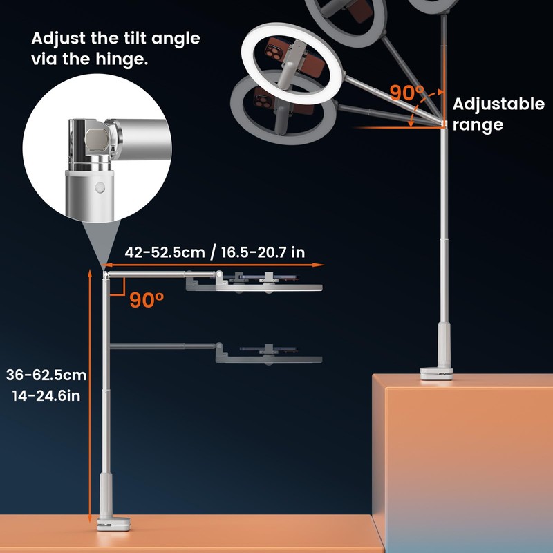 • Sturdy 90 Locking Hinge: This overhead tripod is made of aluminium alloy, height range with light is from 24.2-45.36inch (61.5-115cm). Featuring patented hinge technology, it securely locks the arm at a 90 vertical angle, ensuring stable overhead filming without any slippage