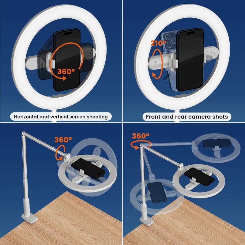 • Multi-scene warrior: The center phone holder flips 210 between selfies to product shoots, with 360 spin for portrait & landscape. Fits phones 2.44-3.54" wide (iPhone 15 Pro Max to S24 Ultra) and stays firmly in place, even when tilted 90 overhead. Additionally, the ring light is fully adjustable, rotating 360 to meet your specific lighting needs