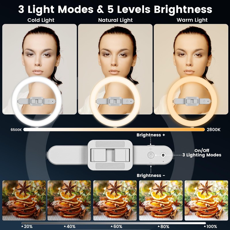• Professional Lighting Control: Designed with 144 CRI90+ ultra-bright LED beads (1000 lumens), achieve studio-quality lighting in 3 modes: warm light (2700K) for cozy ambiance, natural light (4500K) for makeup tutorials, and cold light (6500K) for crisp video calls. The 5-level brightness lets you fine-tune lighting from morning coffee reviews to midnight baking ASMR sessions seamlessly