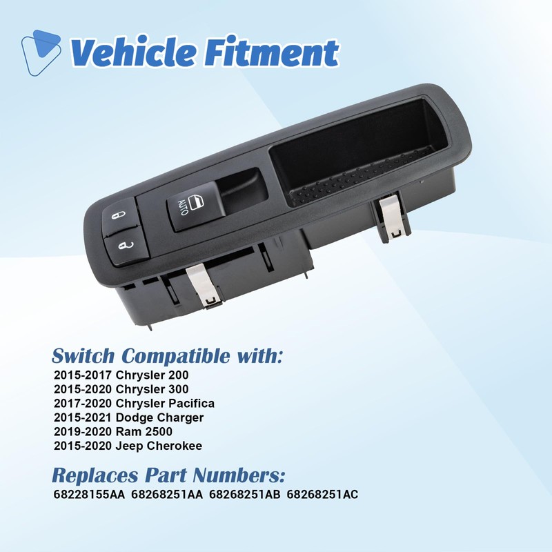 • 【Compatibility】This passenger window switch control button compatible with 2015-2020 Chrysler 300, 2015-2017 Chrysler 200, 2017-2020 Pacifica; 2015-2021 Dodge Charger; 2019-2020 Ram 2500; 2015-2020 Jeep Cherokee
