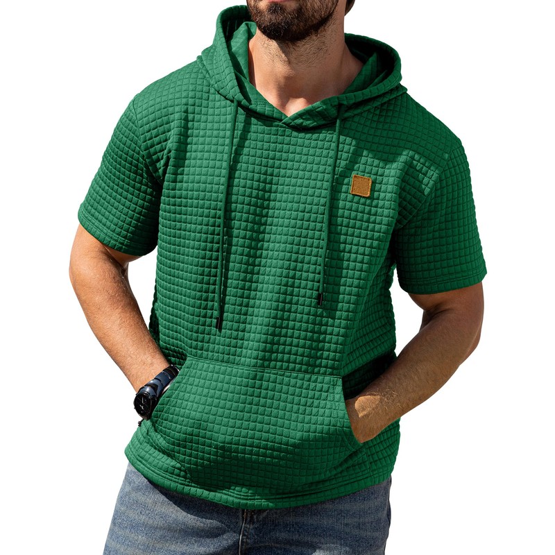 - Casual pullover hoodies featuring waffle pattern for visually striking texture, solid color, short sleeves, with adjustable drawstring and front kangaroo pocket. ribbed waistband and cuffs. Simple and stylish for daily wear.