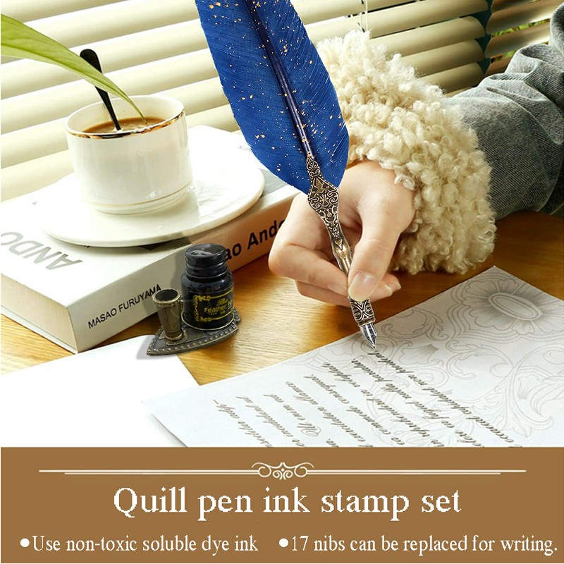 - 【Excellent Feather Pen】:Quill Pen dip pens are made of natural feathers. Feather have different shapes and sizes. After silk production, dyeing and degreasing treatment, it is sprinkled with golden powder to maintain the permanent silk luster. Our feather dip pens provide superior control and stability delivering smoothness and an easy ink flow. with ink attached. With 17 pen tips of different sizes, you can write characters of different sizes.