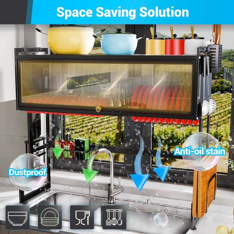 - 【Multiple Uses】This over the sink dish drying rack is a multifunctional kitchen shelf, designed for various kitchen utensils. It can hold not only any shape of plates, but also bowls, cups, knives, forks, spoons, cutting boards, and cleaning supplies. It also features a plastic cover for dust-proof storage (please remove the protective film on the cover before use).