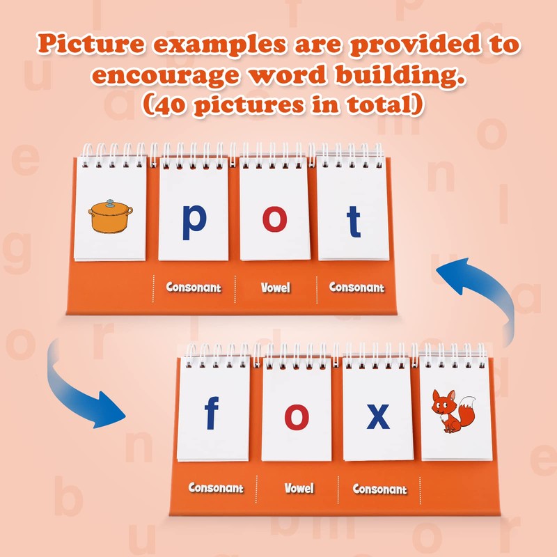 - 【Educational Toy for Early Childhood Development】 Look at the picture and build the word,then flip the picture card and change one letter to match the picture (bus becomes bug). Learning to read and write CVC words improves children's phonemic awareness, reading fluency, and handwriting skills. This phonics flash cards includes building CVC words and matching, letter recognition, word association, and spelling.