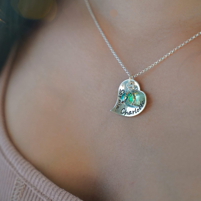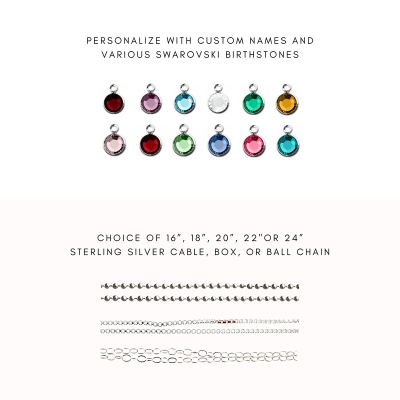 Features: Sterling silver heart charm (6 left and 7 characters on the right max) crystal Birthstones Choice of 16”, 18”, 20”, 22"or 24” sterling silver cable, box, or ball chain