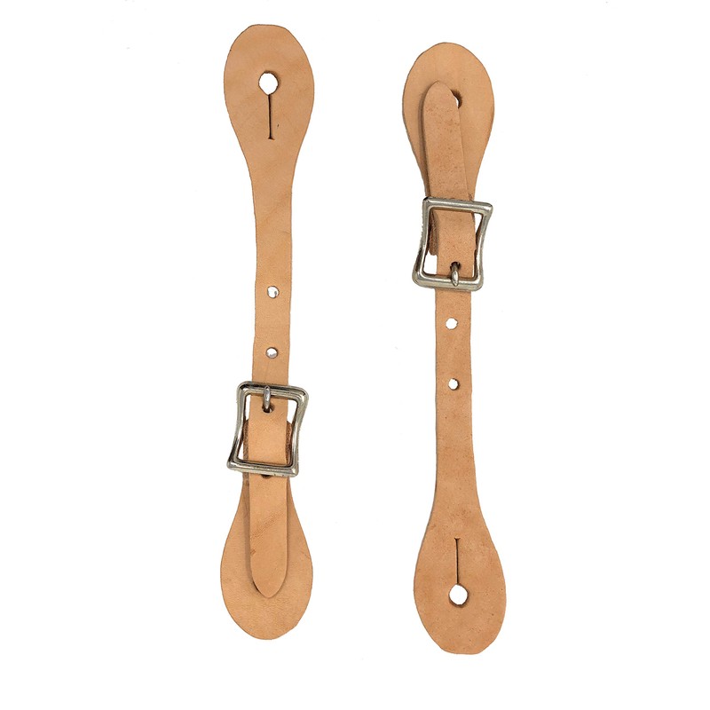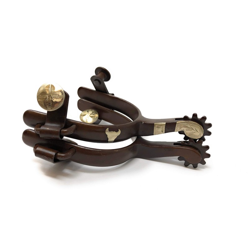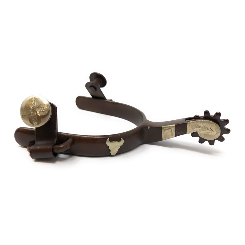 - Pair of antique color youth spurs with hand engraved silver bull skull. Comes with leather spur straps.