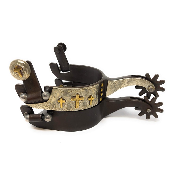 - Pair of western show spurs in antique brown color. Hand engraved silver overlay with brass three cross motif, one cross on button.