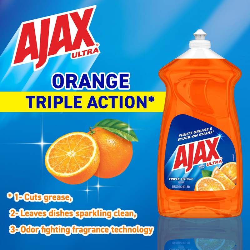 Boost your dishwashing experience with Ajax Ultra Liquid Dish Soap. We have combined your favorite orange scent with the efficacy of Ajax that fights grease and stuck on stains. This variant's distinctive triple action (1) ensures a superior cleaning experience every time. Our innovative formula cuts grease, leaves dishes sparkling clean, and contains an odor fighting fragrance technology (1). This orange dish soap not only leaves your dishes sparkling clean but easily dissolves stuck on grease with a delightful burst of citrus freshness. This dishwashing liquid is made with naturally inspired fragrances, zero parabens and no phosphates. The power of Ajax Ultra goes beyond the sink. This versatile kitchen dish soap allows you to pre-treat laundry, wash tires, and wipe down appliances. Life is tough, but you're tougher! We understand that life isn’t easy. You work hard—heck, REALLY hard. You tackle big and small tough jobs, without looking for applause. That’s why we at Ajax recognize you, the everyday heroes, who step up at the end of a long day and get the dishes done. Because, let’s face it, at the end of the day a clean home is a happy home. Leave the grime to us so you can get back to what really matters! (1) Cuts grease, leaves dishes sparkling clean, odor fighting fragrance technology