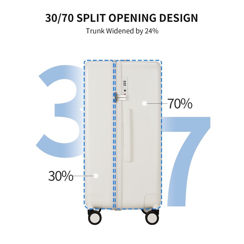 Innovative 70/30 Split Design: Elevate your travel experience with our innovative 70/30 Split Opening Luggage, meticulously crafted to maximize efficiency and functionality. This sophisticated luggage design features a unique 70/30 split that enhances storage capacity by an impressive 30%, ensuring you have ample space for all your travel essentials.
