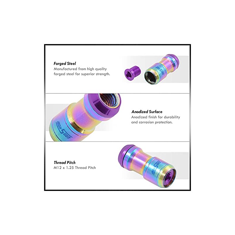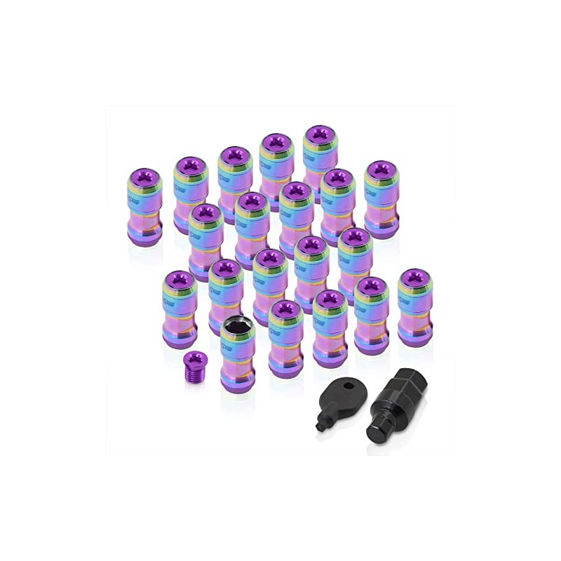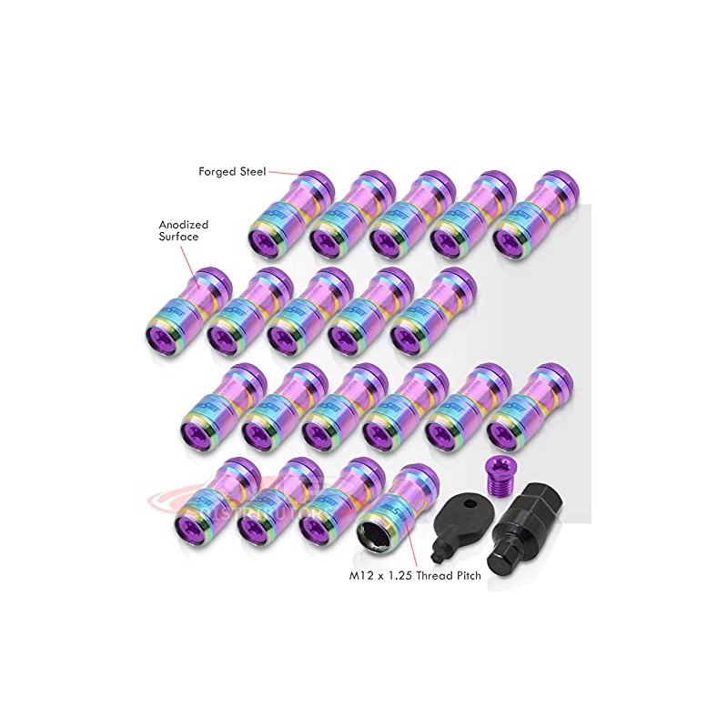 AJP Distributors 20 Piece Universal M12x1.25 Open or Closed End Steel Lug Nuts, 20pc M12 x 1.25MM Lug Nut Set + Locking Adapter Key Socket Wheels Rims JDM VIP Kit Neo Chrome Body Purple Cap