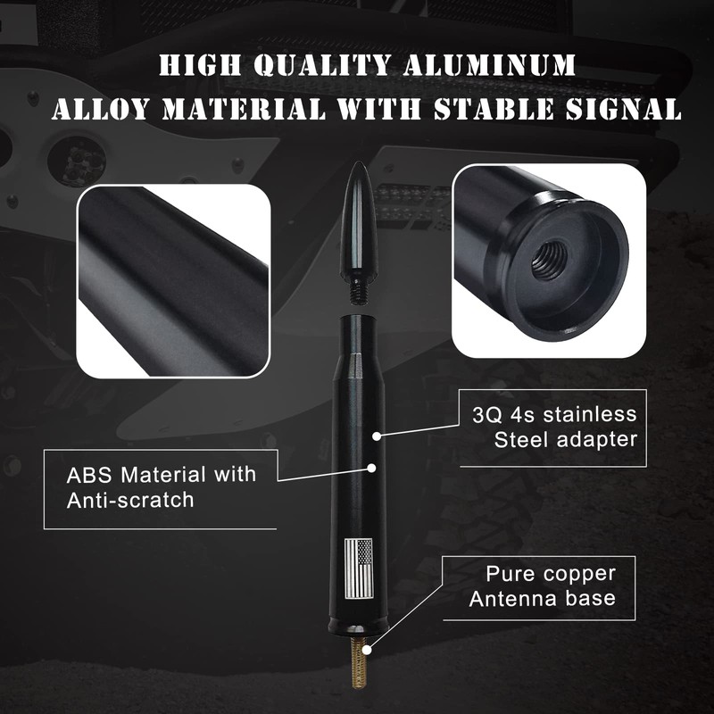- Durable Materias: This bullet antenna is made of high quality billet aluminum and is strong and durable. The antenna is bright and colorfast. It is weather and corrosion resistant for longevity. In addition, the antenna is short enough. That you no longer need to worry about scrapping your garage door.