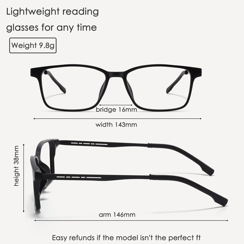 - *Ultralight 9.8g Frame with TR90 & Titanium*Featherweight reading glasses (only 9.8g!) combine flexible TR90 frame + durable titanium temples for unbreakable comfort. Ideal for all-day wear without nose/ear pressure.