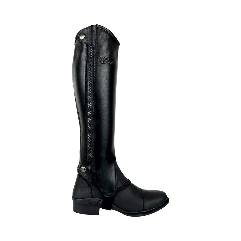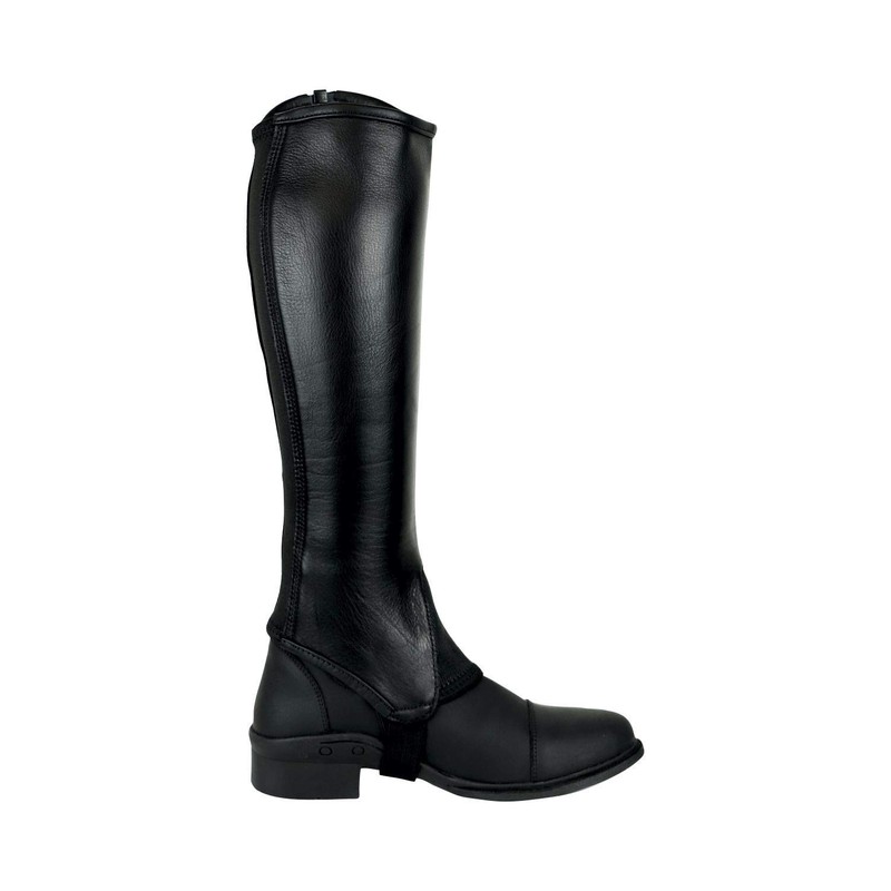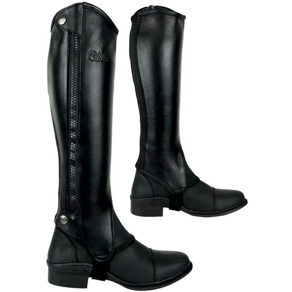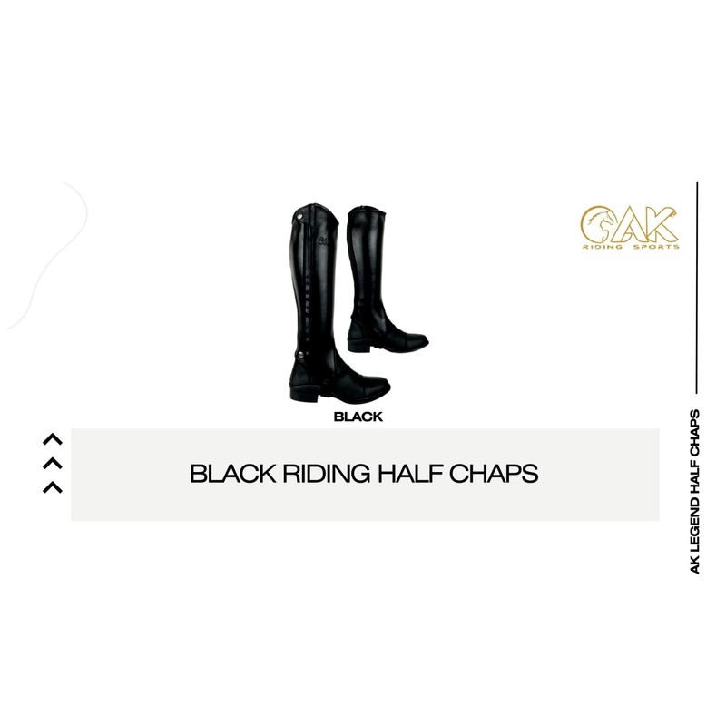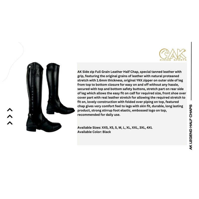 AK Side zip Full Grain Leather Half Chap, special tanned leather with grip, featuring the original grains of leather with natural proteaned stretch with 1.6mm thickness, original YKK zipper on outer side of leg from top to bottom closure for easy on and off without any hassle, secured with top and bottom safety buttons, stretch part on rear side of leg which allows the easy fit on calf for required size, front shoe over cover part with real leather stretch for allowing the required stretch to fit on, lovely construction with folded over piping on top, featured chap gives very comfort feel to legs with skin fit, durable, long lasting product, strong stirrup foot elastic, embossed logo on top, recommended for daily use. Available Sizes: XXS, XS, S, M, L, XL, XXL, 3XL, 4XL Available Color: Black View the measurement chart to assume your required size