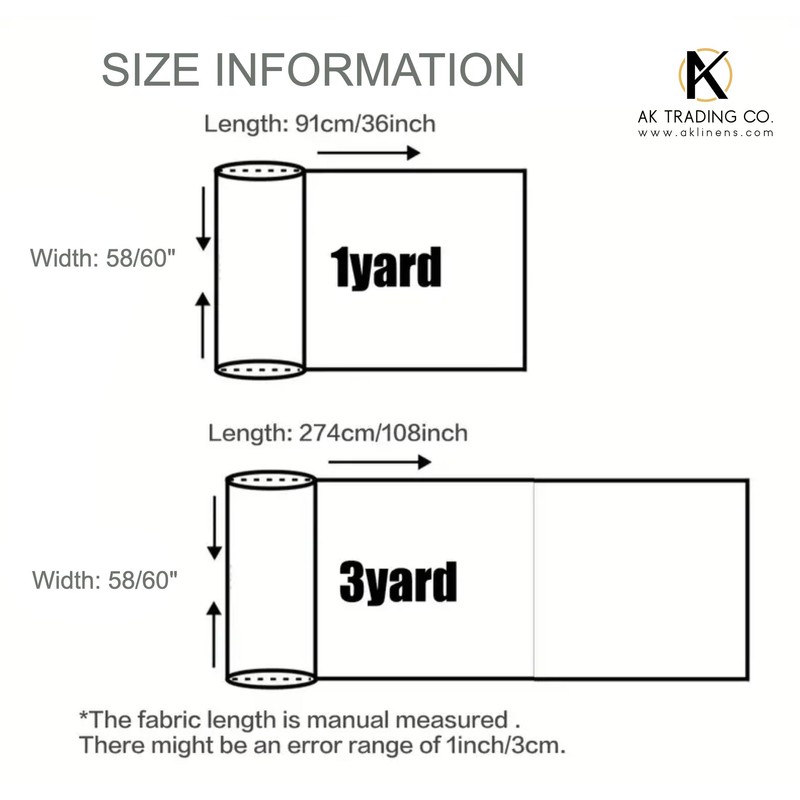 • WIDTH: This Fabric is 60'' in width. Each order comes in 1 full length piece. For example, if you order a quantity of 5, you will receive a 5 yard piece measuring 60'' x 180''. If you order a quantity of 15, you will receive a full 15 yard piece measuring 60'' x 540''.
