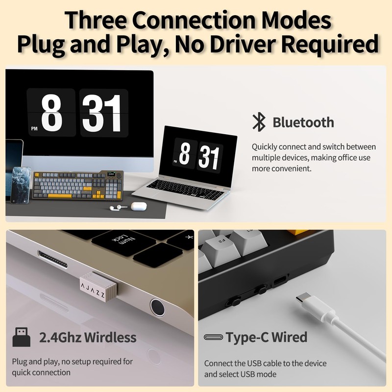 - 【8000mAh Battery Life and Triple Mode Connection】Rechargeable Bluetooth mechanical keyboard with built-in 4000mAh large-capacity battery and low-power module, which can provide sufficient power for vacations and business trips; Bluetooth 5.0, wireless 2.4G and type-c wired modes are the most popular can be connected to 3 devices, providing you with more choices for rich devices, perfect for your desktop computers, smartphones, tablets and laptops.