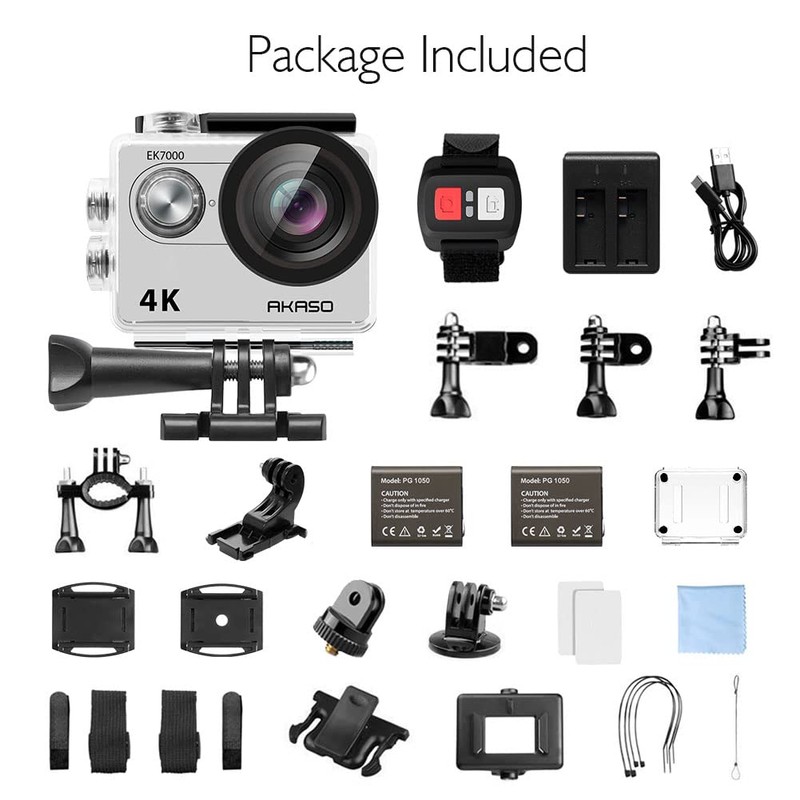 - Longer battery life. AKASO EK7000 action camera comes with 2 rechargeable 1050mAh batteries. Each battery can record up to 90 minutes. No more worry about the recording time for this Action camera.