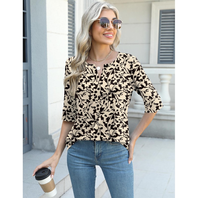 AKEWEI 3/4 Length Sleeve Womens Tops Blouse V Neck T Shirts for Women Plus Size Tunic Casual Summer 2025 Apricot Black Floral XXL