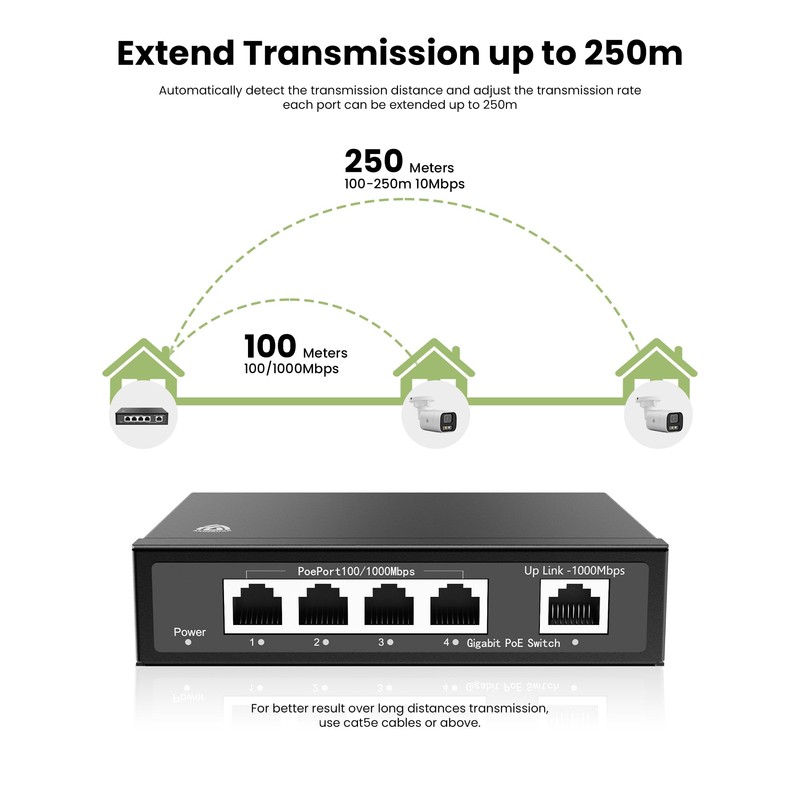 - 4+1 Gigabit PoE Switch: This is a 5-port Gigabit PoE switch. It has 4 10/100/1000Mbps RJ45 PoE ports and one 10/100/1000Mbps RJ45 UPLINK port that is compliant with the lEEE802.3at/af PoE power supply standard. Supports PoE power up to 30W for each PoE port. Total PoE power budget 65W (including external power)