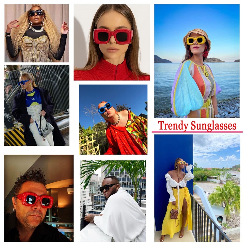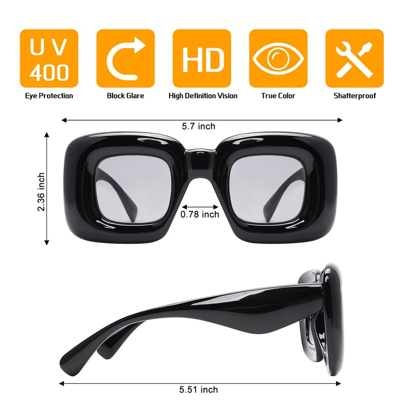 - 【CUTE INFLATABLE GLASSES】: These chunky inflatable rectangular sunglasses are the latest designer style.The thick frame of the candy color is strong and durable. The unique appearance makes your face look young and active.They are suitable for all face shapes.Red, Black,White, pink, yellow, blue, and so on, multiple colors provide sufficient choices to match different outfits in your daily fashion.