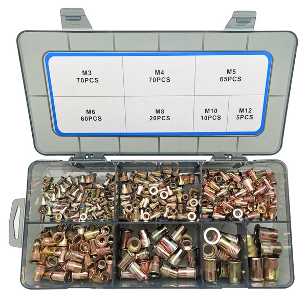 - What you get: the AKKTOL rivet nuts assortment kit comes with 300 pieces rivet nuts in a sturdy transparent box. M3 x 70 pieces, M4 x 25 pieces, M5 x 65 pieces, M6 x 60 pieces, M8 x 20 pieces, M10 x 10 pieces, M12 x 5 pieces.
