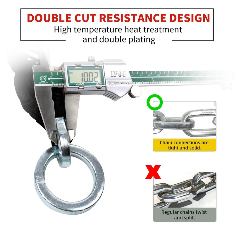 - 【Specification】1600mmx38mmx10mm (with 32 cut resistant chains). Weight: 8.7lb/3.95kg. New upgrade silver chain, non-toxic, more environmentally friendly materials. Long enough to lock 2 to 3 motorcycles together.