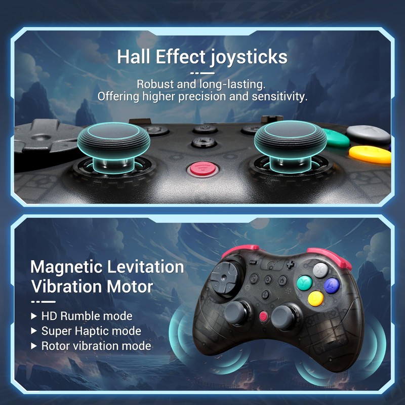 - Retro Design Meets Modern Tech - Designed with an ergonomic retro-inspired shape for all-day comfort, this controller pairs classic aesthetics with cutting-edge features. Dual magnetic levitation motors deliver 3 rumble modes—HD Rumble, Super Haptic, and Rotor — with 3 intensity levels to match your play style.