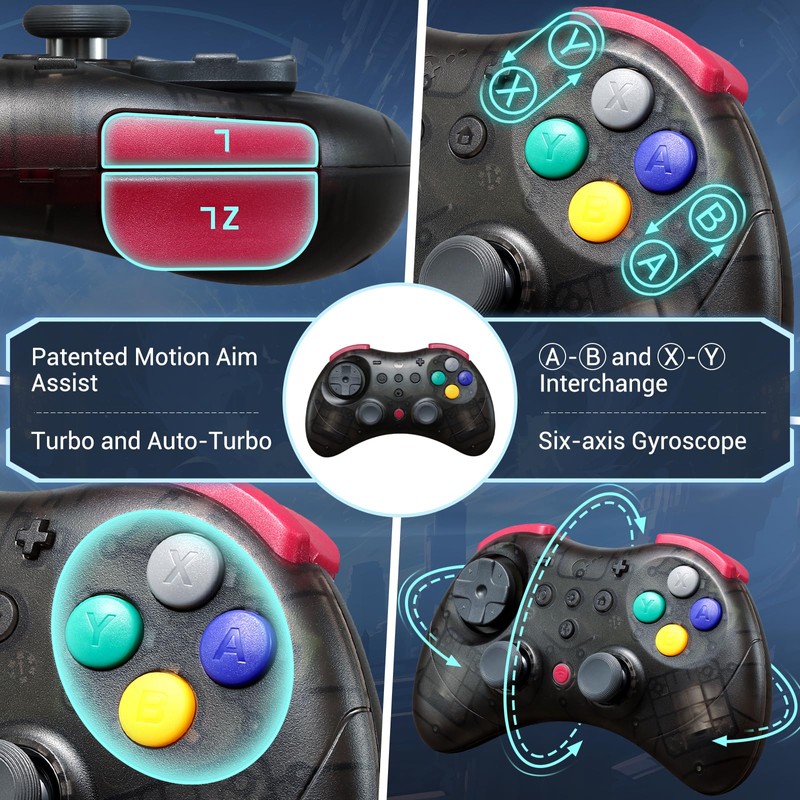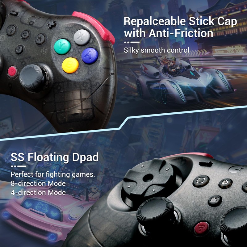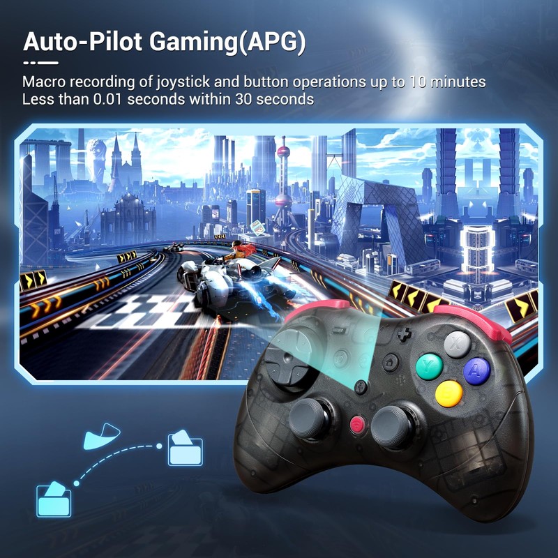 - Pro-Grade Features - Built for competitive players, this controller includes a floating D-pad (switchable 4/8-way), digital triggers, and a 6-axis gyro sensor with motion aim assist—perfect for FPS games on PC. Quick-access features like 10-minute macro recording (auto-execute combo moves), one-touch Switch wake-up(Not support Switch 2), turbo buttons, and AB-XY buttons swap let you dominate games faster.