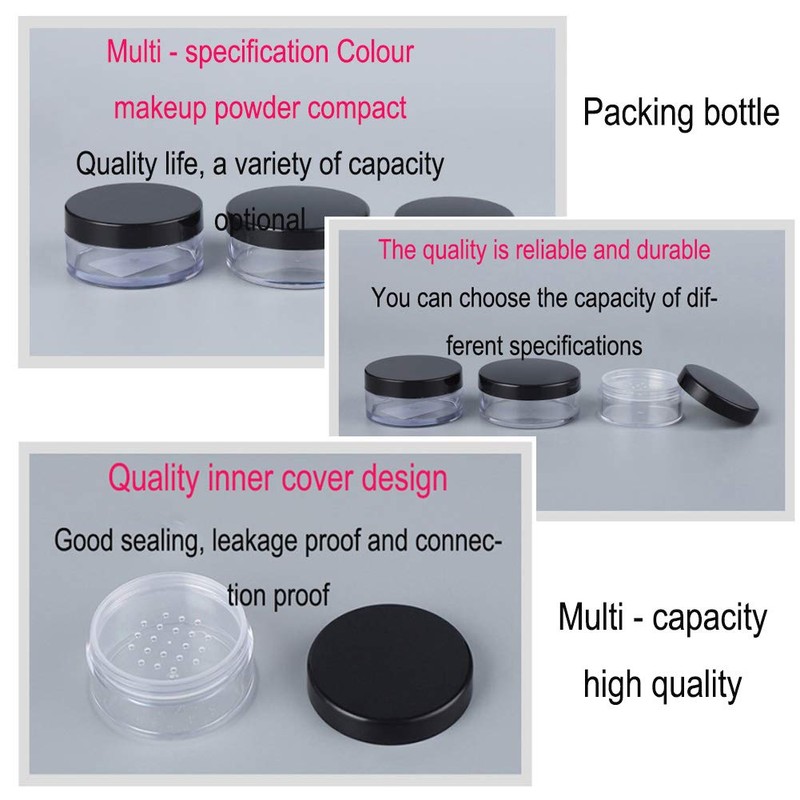 **Description:** Material: PS Size :(approx) 5 g:23*38 mm 30 g:28*58 mm 50 g:31*70 mm Capacity: 5 g/30 g/50 g Color: black cap + transparent bottle body Style: 3 pcs of 5 g/3 pcs of 30 g/3 pcs of 50 g Packaging includes:3 pcs separate travel bottles **USES:** These travel containers can easily store cosmetics such as kohl, foundation, blush, etc., for a variety of purposes. **Features:** 1\. Durability and high quality. Each container has a black lid and liner, forming a tight seal, not easy to leak. 2\. Cosmetics, cooking and more. These boxes are perfect for storing cosmetics, kohl, foundation, blusher or other beauty AIDS. 3\. They are also good for storing jewelry, jewelry, amulets, trinkets, beads, earrings, earrings, and more. 4\. Their delicate and small appearance makes them ideal sample containers. Perfect for art rooms, classrooms, and keeping babies organized at home or in the office. 5\. Store everything from food to cosmetics to art supplies and hardware. The possibilities are endless! **Function:** The right small size and light weight are great for travel, good airtightness, no fear of staining your luggage, and leakproof travel cans. **Notes:** 1.Due to the different display, the picture may have color difference, please understand. 2.Due to manual measurement, there may be a 1-2 cm error in the size, please forgive .
