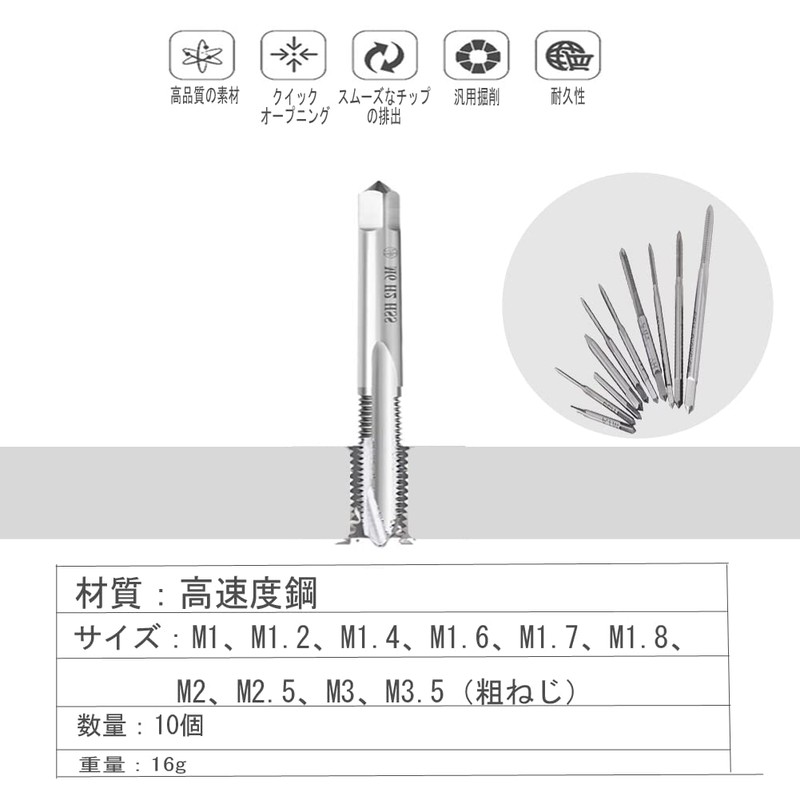 These machine hand taps are made of high speed steel which has high abrasion resistance and heat resistance. It is durable and long lasting. There are 10 total pieces of various sizes from M1 to M3.5, which can be used to tap various screws. Tap to create a smooth tapping experience.