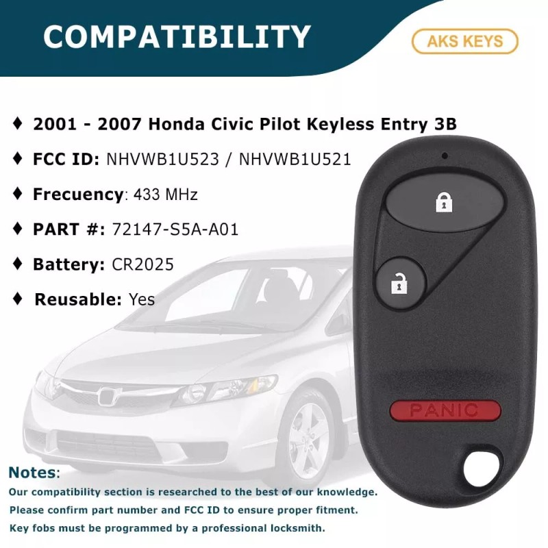 2001 - 2007 Keyless Entry Remote Control Replacement for Honda FCC# NHVWB1U523 / NHVWB1U521 (433 MHz)Apply for:2001 - 2005 - Civic2003 - 2007 - PilotFcc Id: NHVWB1U523 / NHVWB1U521Frequency: 433 MHzPart #: 72147-S5A-A01The aftermarket products don't have logo. /* FONTS AND COLORS */ body { font-family: Arial,sans-serif; font-size: 14px; line-height: 1.428571429; color: #333; background-color: white; } h1, h2, h3, h4, h5, h6 { color: black; } .navbar a, .navbar a:active, .navbar a:hover, .navbar a:visited { color: #333; } .product-specs { background-color: #f1f1f1; padding: 1em; } .product-specs td { font-size:12px; } .attr-left { min-width:6em; font-weight:bold; vertical-align:top; } .attr-right { vertical-align:top; } div.footer { border-top: 1px solid ##195e83; } .navbar-default { background-image: -webkit-linear-gradient(top, #195e83 0%, #f2f2f2 100%); background-image: linear-gradient(to bottom, #B4D5E8 0%, #B4D5E8 100%); background-repeat: repeat-x; border-radius: 4px; -webkit-box-shadow: inset 0 1px 0 rgba(255, 255, 255, 0.15), 0 1px 5px rgba(0, 0, 0, 0.075); box-shadow: inset 0 1px 0 rgba(255, 255, 255, 0.15), 0 1px 5px rgba(0, 0, 0, 0.075); } .navbar-default .navbar-nav > .active > a { background-image: -webkit-linear-gradient(top, #ebebeb 0%, #f3f3f3 100%); background-image: linear-gradient(to bottom, #ebebeb 0%, #f3f3f3 100%); background-repeat: repeat-x; -webkit-box-shadow: inset 0 3px 9px rgba(0, 0, 0, 0.075); box-shadow: inset 0 3px 9px rgba(0, 0, 0, 0.075); } /* LAYOUT - CHANGING THESE WILL AFFECT THE SIZE AND LAYOUT OF YOUR AD TEMPLATE */ /* Responsive Columns */ .col-md-6{width:100%;} .col-md-12{width:100%;} .container{margin:auto;width:100%;} @media (min-width:768px){ .container{width:750px;} .col-md-12, .col-md-6{float:left;} .col-md-6{width:48%; margin:1%;} } @media (min-width:992px){ .container{width:970px;} .col-md-12,.col-md-6{float:left;} .col-md-6{width:48%; margin:1%;} } @media (min-width:1200px){ .container{width:1170px;} .col-md-12,.col-md-6{float:left;} .col-md-6{width:48%; margin:1%;} } .img-responsive{display:block;height:auto;max-width:100%;} /* Responsive Navigation Bar */ .nav{padding-left:0;margin-bottom:0;list-style:none;} .nav:before, .nav:after{display:table;content:" ";} .nav:after{clear:both;} .nav:before, .nav:after{display:table;content:" ";} .nav:after{clear:both;} .nav > li{position:relative;display:block;} .nav > li > a{position:relative;display:block;padding:10px 15px;} .nav > li > a:hover, .nav > li > a:focus{text-decoration:none;background-color:#eeeeee;} .nav > li > a > img{max-width:none;} .navbar{position:relative;min-height:50px;margin-bottom:20px;border:1px solid transparent;} @media (min-width:768px){.navbar{border-radius:4px;} } .navbar-header:before, .navbar-header:after{display:table;content:" ";} .navbar-header:after{clear:both;} .navbar-header:before, .navbar-header:after{display:table;content:" ";} .navbar-header:after{clear:both;} @media (min-width:768px){.navbar-header{float:left;} } .navbar-collapse{max-height:340px;padding-right:15px;padding-left:15px;overflow-x:visible;border-top:1px solid transparent;box-shadow:inset 0 1px 0 rgba(255,255,255,0.1);-webkit-overflow-scrolling:touch;} .navbar-collapse:before, .navbar-collapse:after{display:table;content:" ";} .navbar-collapse:after{clear:both;} .navbar-collapse:before, .navbar-collapse:after{display:table;content:" ";} .navbar-collapse:after{clear:both;} .navbar-collapse.in{overflow-y:auto;} @media (min-width:768px){.navbar-collapse{width:auto;border-top:0;box-shadow:none;} .navbar-collapse.collapse{display:block !important;height:auto !important;padding-bottom:0;overflow:visible !important;} .navbar-collapse.in{overflow-y:visible;} } @media (min-width:768px){.container > .navbar-header, container > .navbar-collapse{margin-right:0;margin-left:0;} } .navbar-brand{float:left;padding:15px 15px;font-size:18px;line-height:20px;} .navbar-brand:hover, .navbar-brand:focus{text-decoration:none;} @media (min-width:768px){.navbar > .container .navbar-brand{margin-left:-15px;} } .navbar-nav{margin:7.5px -15px;} .navbar-nav > li > a{padding-top:10px;padding-bottom:10px;line-height:20px;} @media (min-width:768px){.navbar-nav{float:left;margin:0;} .navbar-nav > li{float:left;} .navbar-nav > li > a{padding-top:15px;padding-bottom:15px;} .navbar-nav.navbar-right:last-child{margin-right:-15px;} } @media (min-width:768px){.navbar-left{float:left !important;} .navbar-right{float:right !important;} } LOCKSMITH KEYLESS Our eBay Store Contact Us Add to Favorite Sellers Replacement for Honda Pilot 03 04 2005 2006 2007 Non OEM Keyless Remote Car Fob 2001 - 2007 Keyless Entry Remote Control Replacement for Honda FCC# NHVWB1U523 / NHVWB1U521 (433 MHz)Apply for:2001 - 2005 - Civic2003 - 2007 - PilotFcc Id: NHVWB1U523 / NHVWB1U521Frequency: 433 MHzPart #: 72147-S5A-A01The aftermarket products don't have logo. Product Details MPN RC-HONDA-25C-X1 MANUFACTURER AKS KEYS BRAND AKS KEYS UPC 686461724060 Compatibility Remotes: These replacement Key Fobs work with car models listed in the compatibility section. **Our compatibility section is researched to the best of our knowledge - it is to be used as a suggested guide. Please confirm part number and FCC ID to ensure proper fitment. In general there is no onboard programming procedure for newer Smart Keys. Replacement Car Keys and Key Fobs must be programmed by an locksmith professional . Please contact your local dealership or an automotive locksmith to get an accurate quote so they can program this key fob once you receive it. Guarantee: All Keyless Entry Remote Fobs and Locksmith Tools are 100% tested before listing and once again before shipping. Transmitter, batteries and every button are in great working condition! We will promptly exchange or refund money for any reason. FREE RETURNS . About Us: Based in the USA! LOCKSMITH KEYLESS is the Ultimate Source for Automotive Parts. We Carry Quality Automotive Keys and Accessory Parts at Unbelievably Competitive P