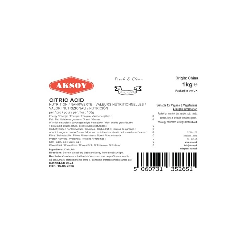AKSOY Citric Acid Food Grade 1000gr || Non-GMO, Anhydrous, Make Your Own BathBomb, Gluten-Free, No Additives, Sour Drinks, Household Cleaning with Citric Acid Powder (Packaging may vary)