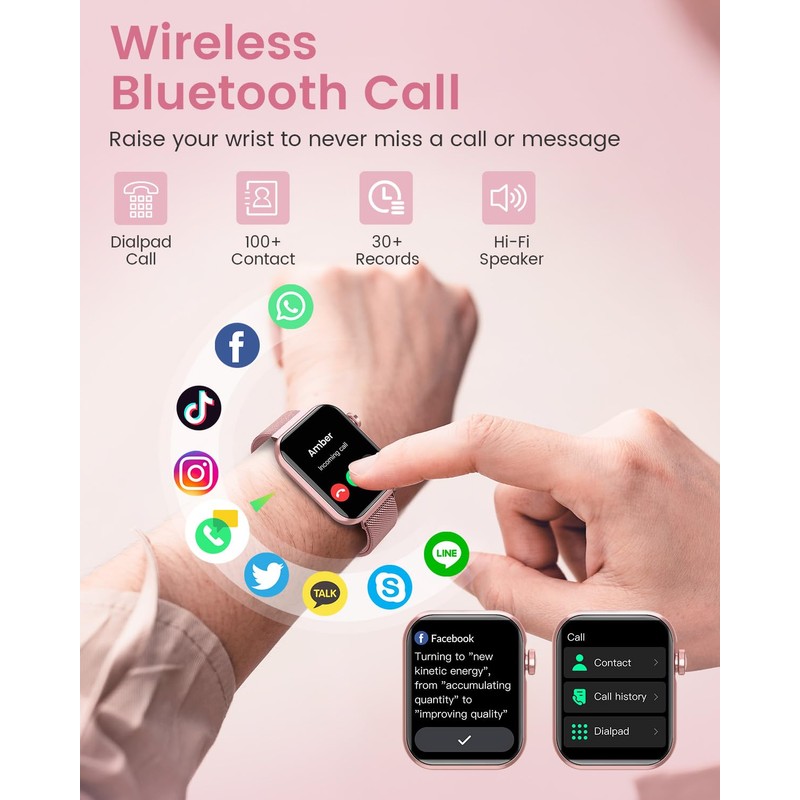 - 【Bluetooth Connection for Calls/ Messages】With Bluetooth connection, you can easily make and answer calls directly on your smart watch without taking out your phone. It will also alert you when there are text messages or notifications from social media like Facebook, WhatsApp and Twitter. Even if your phone is in your bag, you won't miss any important calls and messages. Note that you can't edit or reply to messages from your smartwatch.