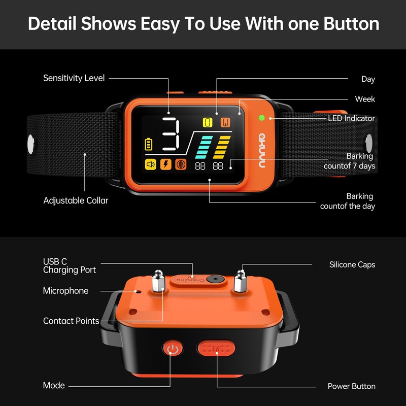 - 【Quick Charging & Protection Mode】Bark collars for dogs charge in just 2 hours and can last up to 15-20 days. adopts an intuitive large LED color interface, which displays richer content and has a strong sense of technology. Effectively eliminates annoying barking at night or when you're away, creating a peaceful environment for your family and neighbors. AKUVU Dog Bark Collar features an intelligent protection mode, automatically pausing for 1 minute after 6 stimulation