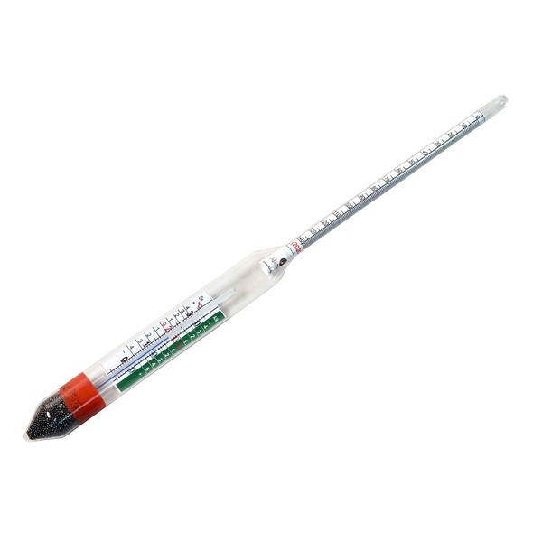 Premium quality Oechslemeter, named after Ferdinand Öchsle, has a thermometer and colored markings on the scale.
