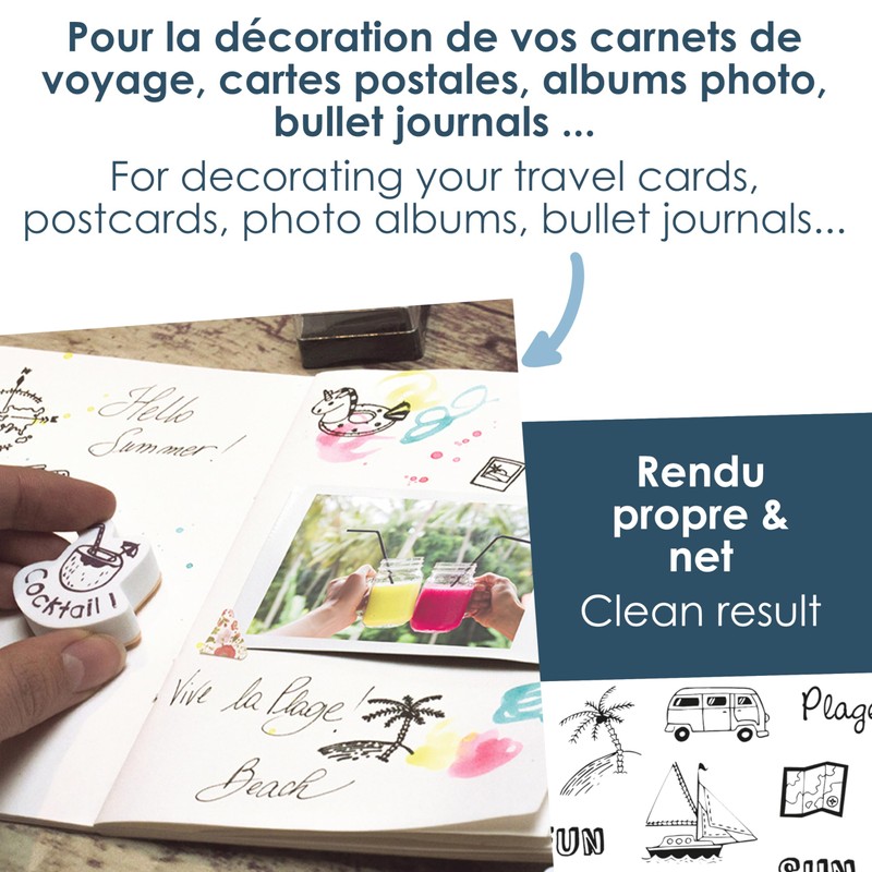- Washable stamps: apply one or more ink colours and press the motif onto the chosen paper: paper, card, card. The black ink pad in this set is an Izink pigment ink with engravable ink. After use, we recommend that you wash the stamps under water and soap (some detergent) without waiting long to have a perfectly clean stamp.