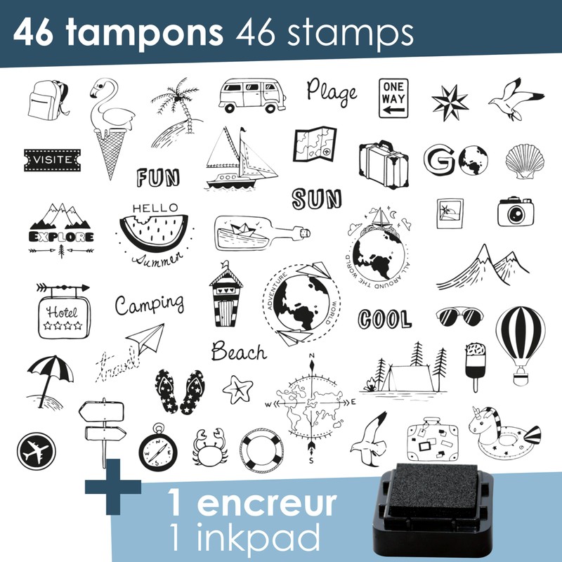 - Izink ink pad included: the kit is ready to use with the included ink pad. It is an ideal gift for anyone who likes to write and personalise their invitations and correspondence. Composition of the set: Cylindrical box filled with 46 stamps in the motif "Voyage" in different sizes and a black ink Izink pigment - insertable ink with slow drying. This set is also available in 15 other designs and in three colour ink boxes (Stampo Izink).