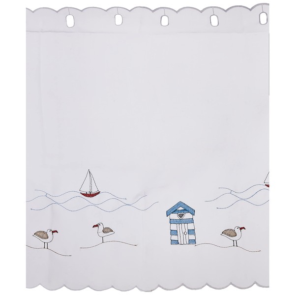 - DESCRIPTION – Ready-made café curtain panel for use with a curtain rod (not included). Each panel comes with an eyelet top for threading onto a thin curtain rod, max diameter 20mm. Each panel features a multi-coloured embroidered design with a scalloped trim, on sheer white voile.