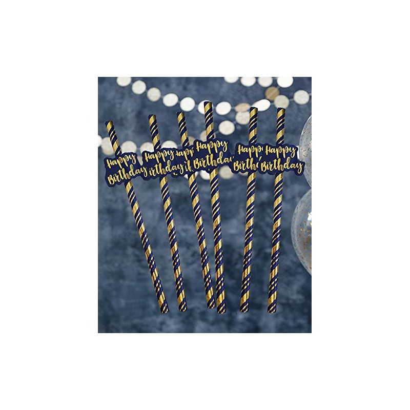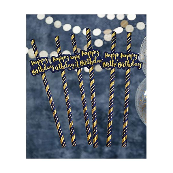 Alandra Party Happy Birthday Navy & Gold Metallic Straws, Pack of 6